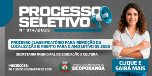 A Secretaria Municipal de Educação e Cultura publicou o Edital nº 014/2025, que regulamenta o Processo Classificatório para Remoção ou Localização de profissionais do magistério da rede municipal para o ano letivo de 2026. O processo contempla professores dos cargos MMAA, MMBB (Arte e Educação Física) e MMCP, conforme legislação vigente. As inscrições serão realizadas exclusivamente pelo site da Prefeitura, das 10h do dia 26 às 17h do dia 30 de novembro de 2025, mediante envio da documentação exigida. A participação é obrigatória para profissionais excedentes e para aqueles que desejam mudar de posto de trabalho. A classificação será definida pela avaliação de títulos, considerando tempo de exercício na rede municipal entre 2015 e 2025 e qualificação profissional, com pontuação específica para especialização, mestrado e doutorado. Em caso de empate, serão observados critérios de qualificação, habilitação e idade. A classificação parcial será divulgada em 3 de dezembro, com prazo de recursos nos dias 4 e 5. O resultado final será publicado em 16 de dezembro. A escolha das vagas ocorrerá no dia 22 de dezembro, no Auditório Professora Aurora Araújo Franzotti, com horários distintos para remoção e localização provisória. A Secretaria reforça que as regras do edital devem ser integralmente observadas e que a escolha da vaga é definitiva, sem possibilidade de desistência ou troca após confirmação. Prefeitura Municipal de Ecoporanga – No caminho do avanço! Edital: LINK DE INSCRIÇÃO https://forms.gle/JTS99Sb9q58nRLao9 RETIFICAÇÃO 1ª RETIFICAÇÃO DO EDITAL Nº 014 (27/11/2025) 2ª RETIFICAÇÃO DO EDITAL Nº 014 (Publicado em 01/12/2025)